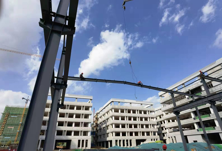 八公司臨廬欣榮農(nóng)民返鄉(xiāng)創(chuàng)新創(chuàng)業(yè)基地建設(shè)項(xiàng)目照常施工,圖為7#、8#樓鋼結(jié)構(gòu)安裝
