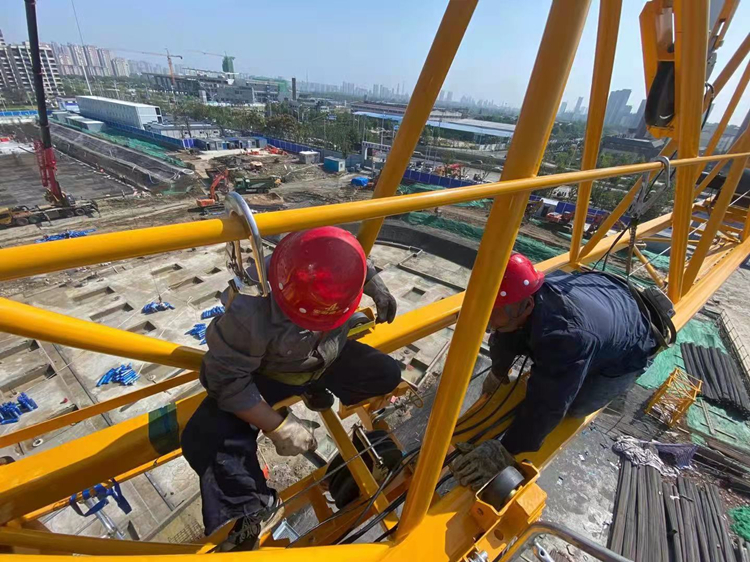 10月1日,設備租賃在合肥一中東校區項目進行塔吊穿繩調試,確保塔吊設備安全運行。