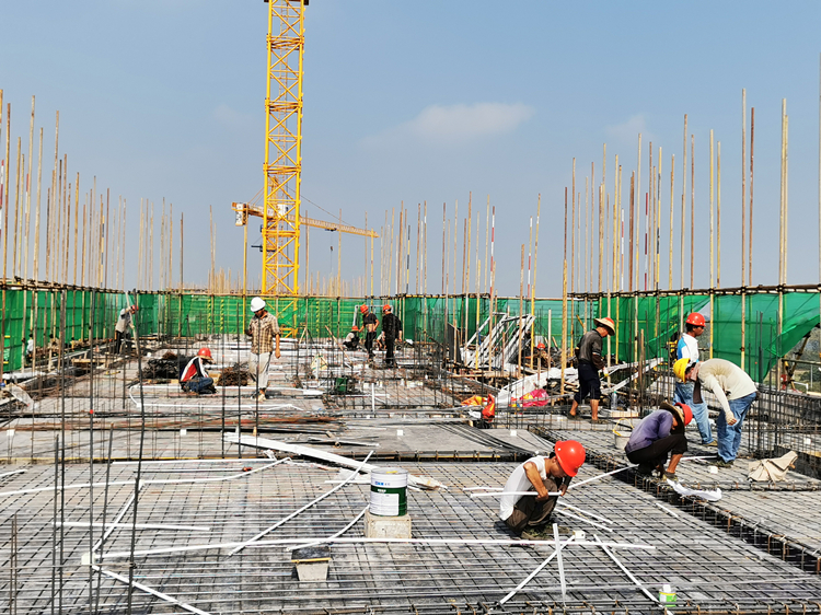 為了按時完成甲方的預售節點,迅速推進工程進度,分公司上下齊心協力。一方面,分公司副經理魯豫、孫剛不間斷地蹲點項目,統籌協調項目重難點工作,合理調配現場人材機,并抽調收尾項目項目經理、技術負責、生產經理等5名骨干人員到該項目,他們主動分片包干,保棟號、搶進度,經過25天的艱苦努力,成果顯著,滿足施工節點要求;另一方面,項目積極協調樁基單位夜以繼日,迅速出土,每天保持6臺以上施工挖機,木工班組和鋼筋班組每棟樓人數維持在40人以上,確保一天完成一棟基礎。重點工序采取24小時兩班倒作業,做到“人歇機不歇”。為了不影響第二天鋼筋綁扎,防水施工通常是通宵加班完成。在塔吊、汽車吊覆蓋不到的地方,大家就手提、肩抗,晚上鋼筋綁扎完成,就馬上澆筑砼。此外,各項工序均要求班組長根據施工進度計劃目標做好施工計劃安排,確保各工序的銜接和工序循環,并針對每天完成的實際情況,實行動態調整。