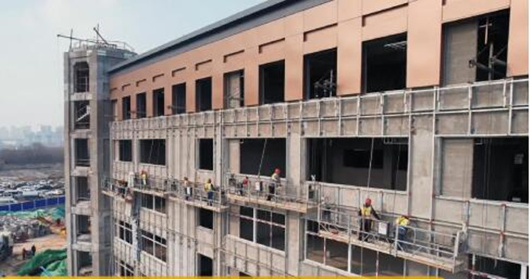 幕墻安裝——是該項目的又一大難題,而解決它的前置條件就是吊籃的架設!經測算,該工程的吊籃使用量不低于500臺。為此,項目部提前組織觀摩多個吊籃公司,制定方案。吊籃安裝時正值室外開挖埋管時期,項目部夜間加班,通過先組裝后吊裝的方式,有效地解決了工作面交叉作業的問題。從2022年1月6日12#、14#宿舍樓的第一批吊籃安裝開始,500多臺吊籃從告知到驗收再到使用登記,項目部加班加點僅用20天就完成了工作,使吊籃的整體使用時間比預期縮短了15天。科創中心樓位于項目西南角、南大門西側,正處于形象展示樣板區域,春節前必須安裝到位。當時已近年關,大量的勞務人員已踏上返鄉的路程。為了不影響項目進度,項目部與吊籃租賃公司多次溝通協調,動之以情,曉之以理,最終在年前把第一批吊籃架設成功,并順利通過驗收,為節點性樣板間的按期完工奠定了基礎。把一切能提前、能加班完成的工作提前完成、加班完成——這是項目所有人的統一思想。