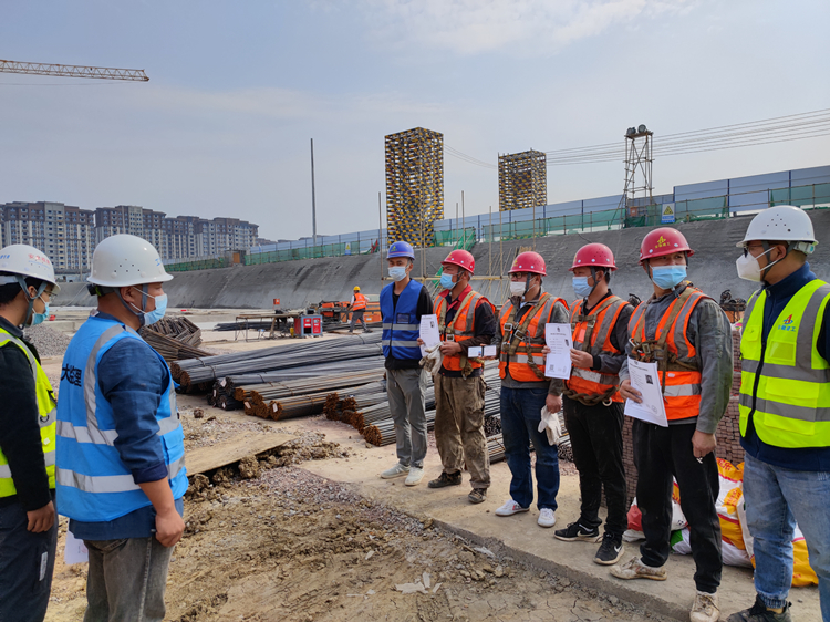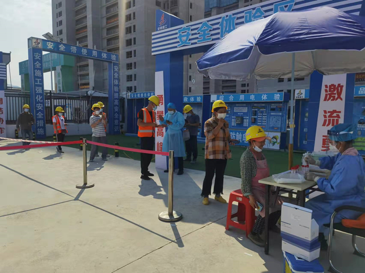 一公司三亞市中心城區(qū)TY04-01-02地塊項(xiàng)目防疫、生產(chǎn)工作“兩手抓”。在疫情初始時(shí)期,立即成立疫情防控工作領(lǐng)導(dǎo)小組,制定防控應(yīng)急預(yù)案。項(xiàng)目至今召開疫情防控工作部署會(huì)議4次。全面落實(shí)防控措施,深入到每個(gè)班組,每個(gè)工人,收集摸排人員信息,簽訂防疫承諾書,發(fā)放防疫物資。有序組織全員參加核酸檢測。組織項(xiàng)目黨員先鋒隊(duì)采購、配送有關(guān)物資,按時(shí)發(fā)放給工人。此外,項(xiàng)目還深入開展宣傳教育,了解每個(gè)工人心理狀態(tài),做好情緒安撫工作,充分利用流動(dòng)喇叭、微信群、宣傳單等形式,廣泛宣傳有關(guān)防控政策措施,提高工人自我防護(hù)意識(shí)。