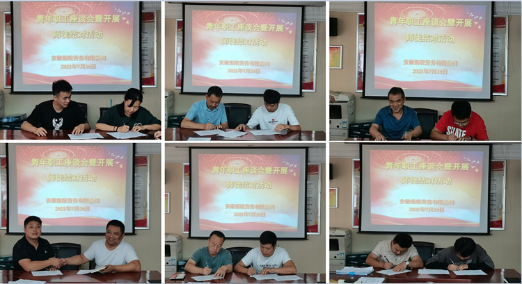 座談會上,青年職工對工作以來的個人成長感受、個人愿景以及對振皖勞務公司發(fā)展的建議意見各抒己見,領導班子成員及部門負責人分享了個人工作經驗并作相關工作要求。會上秉承“以老帶新、言傳身教、共同學習進步”的三建優(yōu)良傳統,為6為青年員工找?guī)煾怠⒔Y對子,簽訂業(yè)務骨干帶徒學藝合同書。