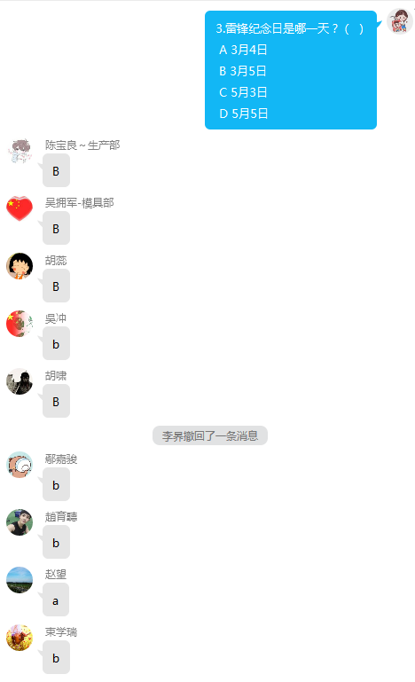 本次知識競賽內容涵蓋雷鋒同志的事跡、生平及榮譽。競賽項目設置為單選題、多選題、填空題三個題型。團支部在團員群里面發送題目,題目發送后第一位答對題目的即為優勝者。競賽前,青年團員們都積極熟悉雷鋒精神有關知識點;比賽中,大家都積極答題、沉著應對、密切配合。本次知識競賽活動讓青年團員們了解了雷鋒精神,并致力將其內化于心,外化于行,進一步學習和弘揚雷鋒精神。