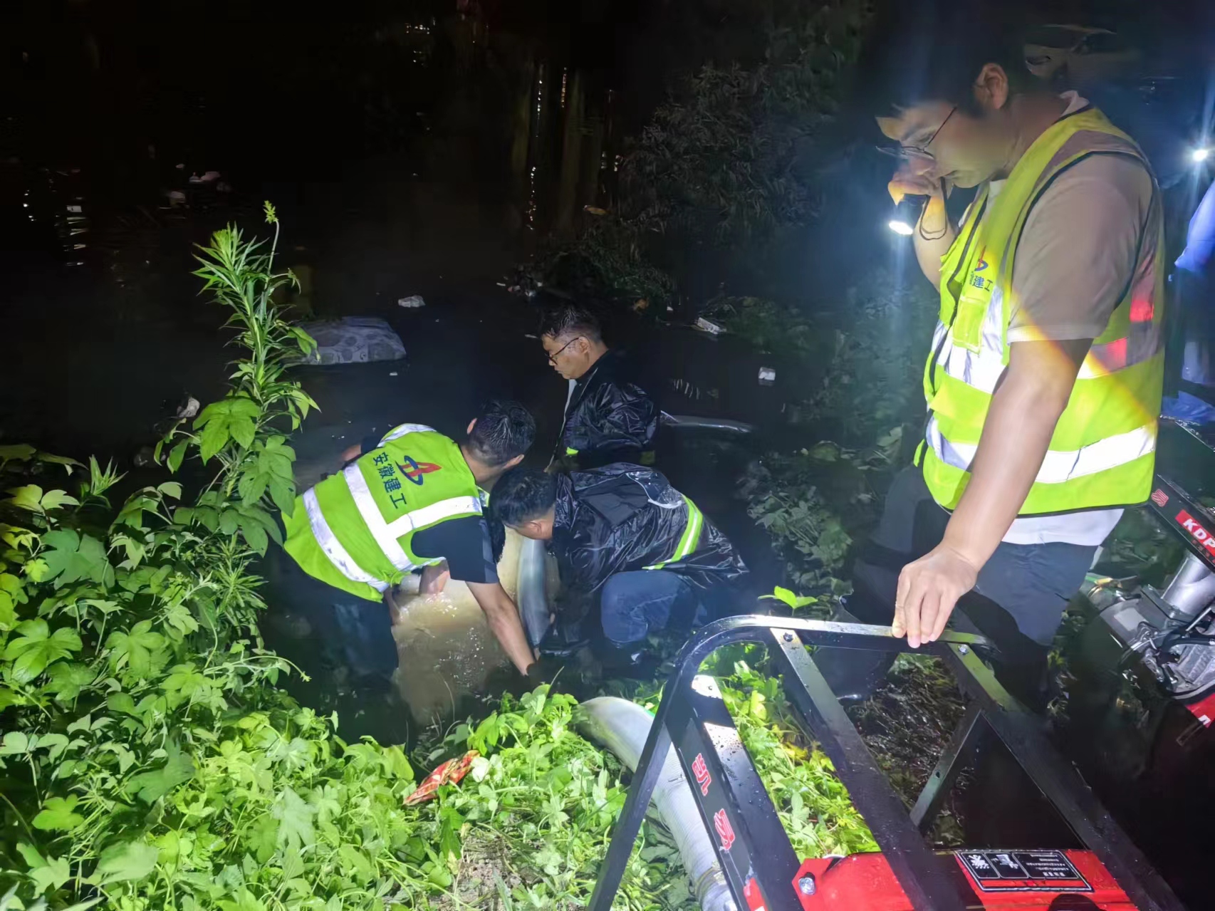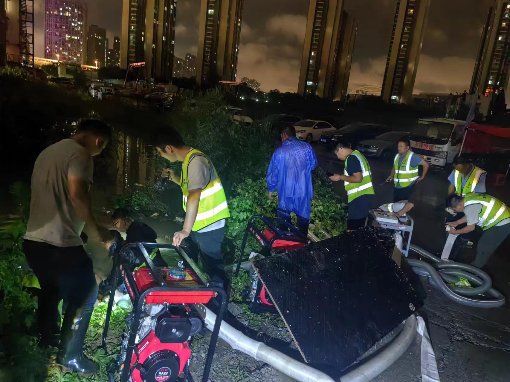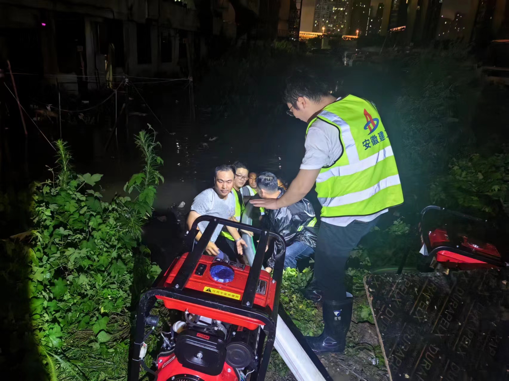 7月2日夜里,肥西縣再次遭受大暴雨的襲擊,防汛形勢異常嚴峻。面對緊急的情況,三建廬西公司的項目人員沒有絲毫猶豫,迅速奔赴各個抗洪點進行搶險。其中,迎財樓點位因排水管道受大暴雨沖擊,導致污水無法及時排出,形成了多處水深超過一米的水坑。在這關鍵時刻,馮沛澤、胡亮、李力洋、徐彪、王安平、朱廣東、朱明祥七名同志挺身而出,他們不顧個人安危,毅然跳入水坑中,手持排水泵奮力抽排污水。經過數小時的連續奮戰,迎財樓區域的水坑倒灌情況終于得到了有效控制,確保了附近居民第二天的正常出行及安全,同時也極大地緩解了當地的防汛壓力。