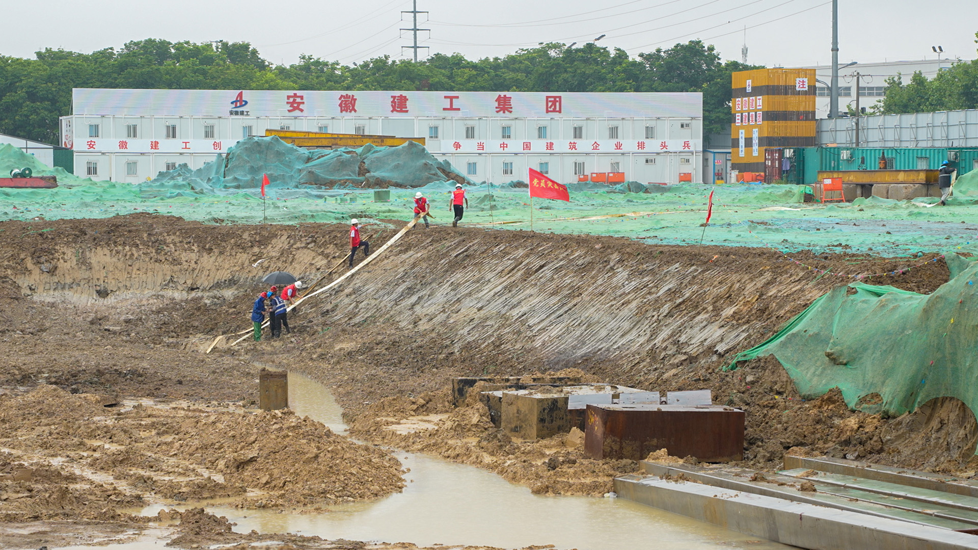 近期,合肥地區正值雨季,施工進度不可避免地受到了影響。面對雨季帶來的不利條件,項目團隊展現出強大的應變能力,積極發揮“兩個作用”,30多名黨員沖鋒在前,奮戰在防汛排澇一線,現場40多臺抽水泵同時作業,挖掘機24小時隨時待命,同時還增設臨時排水管道、優化排水系統,全力抽排項目積水,盡最大可能減少雨季水患對施工進度和質量造成的影響。經過施工團隊的不懈努力,有效避免了施工現場的積水問題,保障了施工的連續性,同時也彰顯了這支“江淮鐵軍”特別能吃苦特別能戰斗的優良作風。