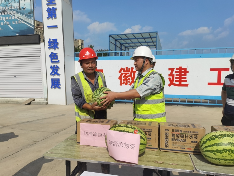 在施工現場,班子成員項目管理人員及一線施工人員發放葡萄糖補水液、礦泉水、西瓜等防暑物資,并親切叮囑一線人員要多補充水份、做好防曬措施,在保證身體健康的情況下進行施工生產工作。此外,分管領導還對施工現場進行安全檢查指導,囑咐管理人員對現場工人進行高溫作業安全宣貫,切實提高工人安全防范意識。