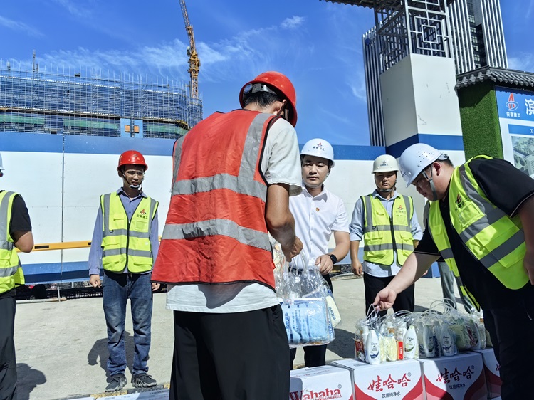 華東公司領(lǐng)導(dǎo)班子深入項目一線慰問了堅守在高溫下施工的員工,走訪了員工的工作生活區(qū),對項目防暑降溫物資配備情況進行了了解,并發(fā)放防暑降溫用品,為項目人員送去夏日清涼。