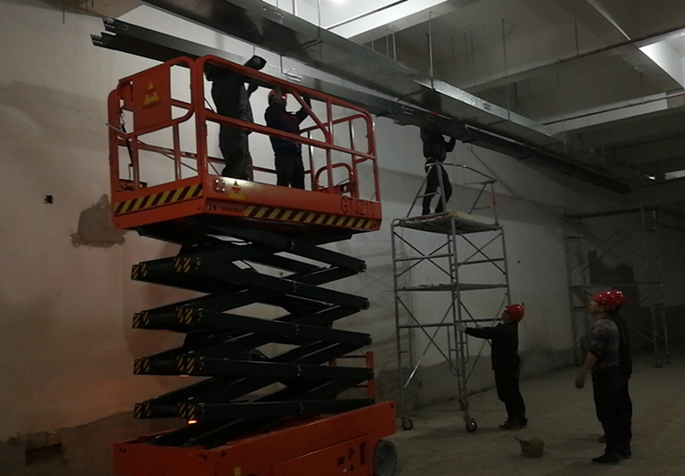 一線作業工人說:“這機器一開,穩當當的就上去了,干活快多了!”。安徽創新館工程因建設需要進行建筑輪廓及功能修改,安裝作業的時經常需要工人到高處進行作業。通常項目高處作業需要4位工人搭設腳手架和人字梯攀爬至高處進行施工,效率低,存在一定的安全隱患。四臺升降機進場后,僅需要2人配合就可以進行橋架、消防管道的安裝作業,且方便攜帶工具及材料,不僅節約了勞動力,還有效的提高了安全性及工作效率。現場管理人員表示四臺升降機進場對提高項目安裝進度,保障項目建設將發揮重要作用。