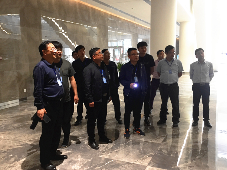 觀摩中,孫俊中對所有項(xiàng)目人員表示親切的慰問,在現(xiàn)場聽取了項(xiàng)目負(fù)責(zé)人王皖對安徽創(chuàng)新館整體建設(shè)情況介紹。隨后孫俊中一行參觀了二號館、三號館。裝飾公司項(xiàng)目經(jīng)理劉維向觀摩團(tuán)介紹了二號館室內(nèi)環(huán)氧磨石工藝、PVC石塑地板鋪貼技術(shù)以及三號館全球路演中心超大型藝術(shù)造型鋼板安裝技術(shù)等等。館內(nèi)光可鑒人的環(huán)氧磨石地面、輕質(zhì)飄逸的穿孔鋁板、氣勢宏偉的路演中心給孫俊中一行留下深刻印象。