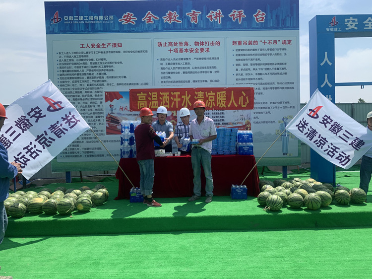 石業兵和徐國鋒邊發放物品,還邊叮囑四期項目經理和基層管理人員,任何時候都要將安全放在首位,要采取有效的防暑降溫和安全生產保障措施,避免高溫時段疲勞作業,防止農民工中暑和其他各類生產安全事故的發生。