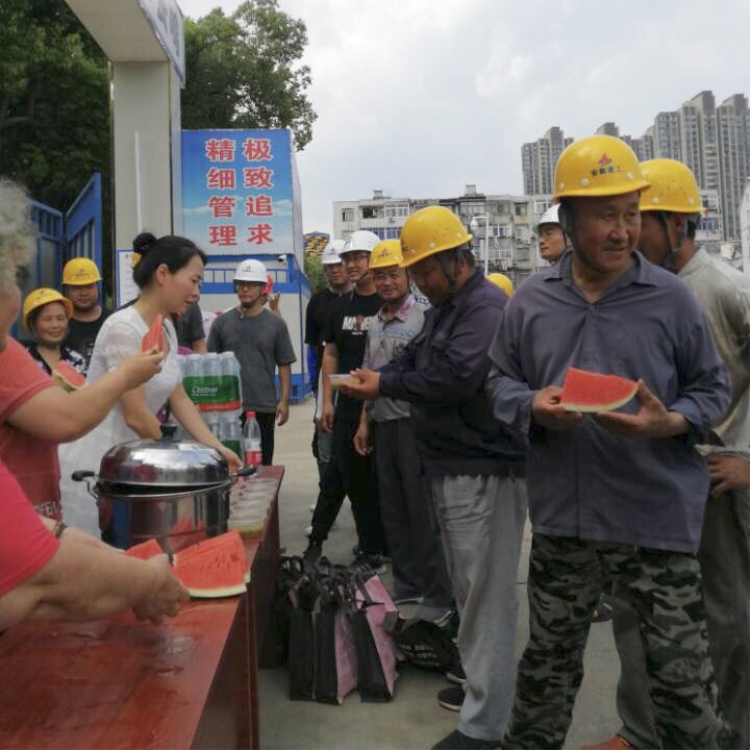 近期連日高溫炎熱,驕陽似火,酷暑難耐。安徽三建十公司蜀山區(qū)動力三村改造項目一線施工人員依然堅守在各自崗位。“你為我筑高樓大廈,我為你送綠豆甜瓜”。三建人揮汗奮戰(zhàn)的精神,感動了當?shù)厣鐓^(qū)百姓。2019年7月25日下午三時,七里塘社區(qū)黨委副書記孫妹娟組織號召社區(qū)8名志愿者集中前往動力三村改造項目的施工現(xiàn)場開展“送清涼”活動,安徽三建十公司支部書記吳明寬、安全科長張玉保、項目經理李其云等人員參加活動。