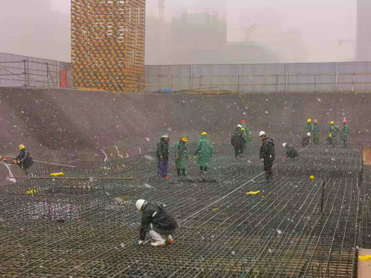 該項目于12月16日開工,甲方要求的1月20日前完成項目首開3棟樓地板結構施工的任務,工期十分緊迫。項目部自開工之初就牢牢樹立“不能按時交工為恥辱”的履約意識,面對嚴寒,項目部施工計劃、各項交底都充分考慮雨天天氣,同時提前做好冒雪工作準備,安全防護、雨衣、膠鞋等防護工作皆已安排到位。由于提前準備妥當,大雪紛飛時,項目施工現場絲毫未受影響,現場一派熱火朝天大干景象,放線的青年員工依舊一絲不茍的放線、自查筏板基礎鋼筋綁扎的依舊盯著鋼筋綁扎情況、加固項目生活板房的仍在一間一間盤查加固。。。 項目部表示,要進一步做好冬季施工的安全、質量、保障等工作,確保項目進度和質量。