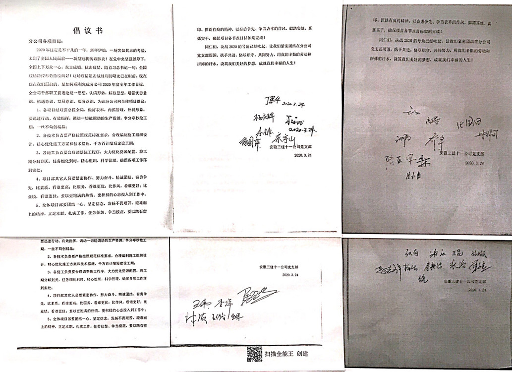 分公司黨支部在倡議書中號召,全體項目部要團結一心、堅定信念,發(fā)揚不畏艱苦、迎難而上的精神,腳踏實地、真抓實干,確保項目各節(jié)點目標如期完成;全體機關人員要主動作為、靠前服務,加強溝通、積極宣傳,一切圍繞項目進度開展工作,保證服務的時效性。