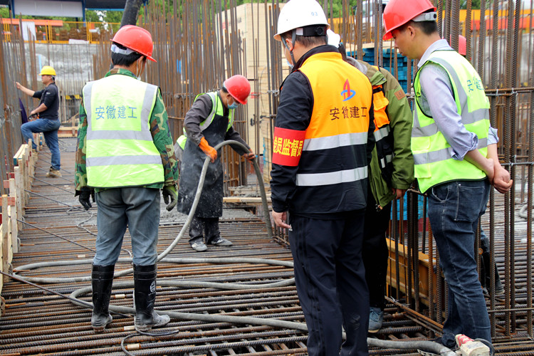 澆筑施工過程中,各班組之間密切配合,項目部管理人員全程跟班作業,全過程旁站、把控和指導,嚴控澆筑順序、振搗方式等,黨員監督崗同志隨機監督,派駐商混站管理人員緊盯原料、外加劑投放質量及運輸車次,確保澆筑連續性,嚴格把控質量關。由于策劃細致,合肥中心圖書館項目大體積混凝土澆筑順利完成,目前混凝土測溫及養護工作正在有序開展。