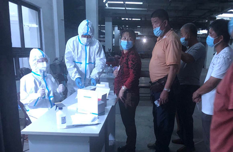 為了確保生產經營和防疫工作兩不誤,金連領地項目經理主動與街道溝通,確認檢測時間,合理分組安排人員檢測,減少對項目施工的影響。為了避免人員聚集。晚間6點,社區居民全部檢測完畢以后,項目經理將15名管理人員和160名工人分為三組,由管理人員分時段帶領工人前往社區指定地點進行核酸檢測。為了減輕社區和防疫工作者的壓力,每隊的小隊長預先對所有工人進行體溫檢測,自我篩查是否有體溫異常的工人,提前指導工人做好信息登記工作,減輕醫護人員的工作量,加快核算檢測工作進展。