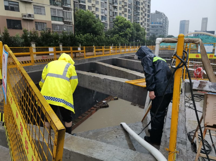 在積極參加地方防汛搶險(xiǎn)工作的同時(shí),六公司認(rèn)真做好在建項(xiàng)目的防汛和安全工作。合肥軌道交通4號(hào)線4標(biāo)段項(xiàng)目積極安排人員24小時(shí)值班,做好車站深基坑的排水,以及車站周邊的雨污水管道的排查,著重做好大強(qiáng)路車站兩端洞口的污水池排水工作,同時(shí)做好呈坎路車站的1號(hào)出入和2號(hào)風(fēng)亭的基坑排水工作,確保了深基坑的安全。