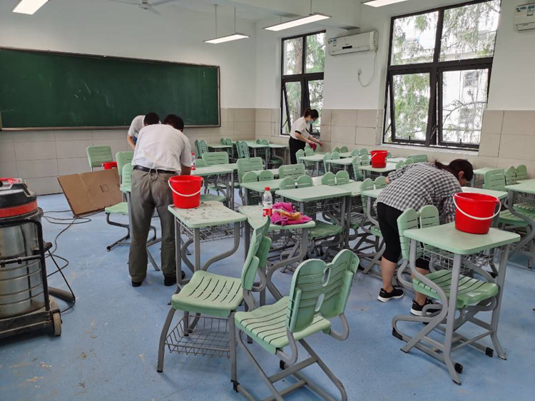 炎炎夏日,三建四公司員工汗流浹背,對各幢教學、各間樓教室逐一進行了整理清掃,大家鏟除墻上瓷磚填縫劑、地面的水泥漿結節物,并用抹布將瓷磚墻面及黑板擦拭了好幾遍,認真將桌椅子擺放整齊,擦拭干凈。經過一天的勞動,教室窗明幾凈,為24日學生返校做好準備。