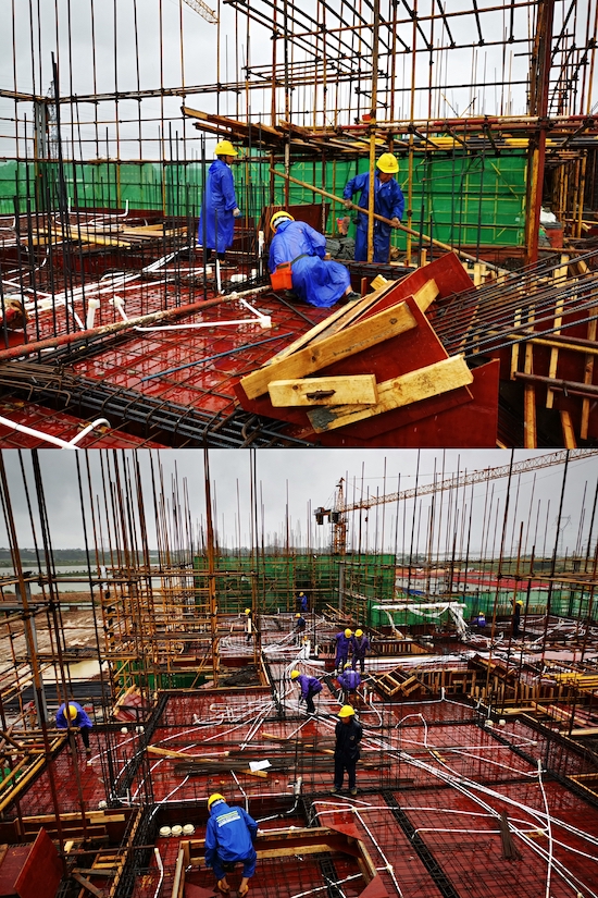 圖為項目管理人員及班組工人雨天搶工