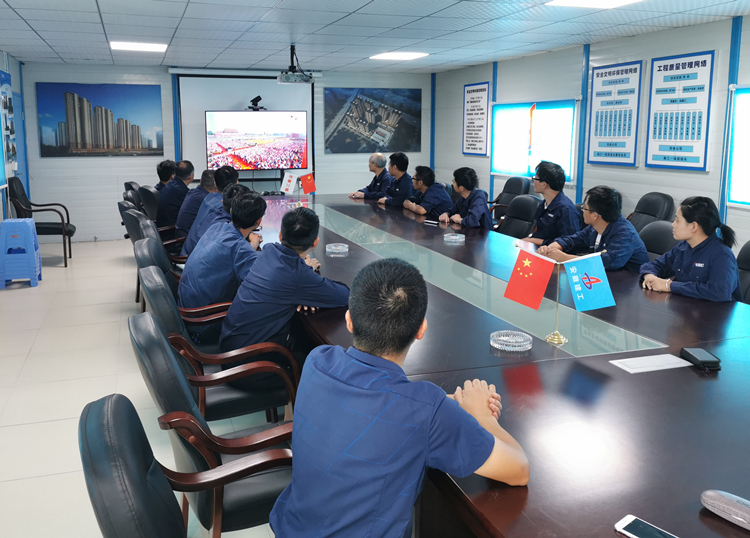 大連公司各項目共85人集體觀看慶祝中華人民共和國成立70周年大會盛況及閱兵儀式直播,圖為煙臺力高項目集中收看情況