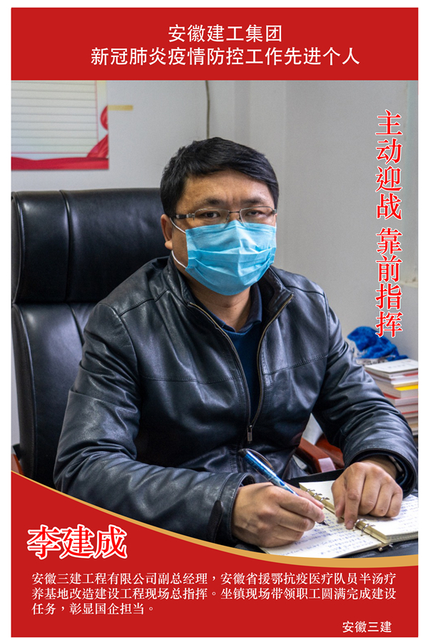 李建成,安徽三建工程有限公司副總經理,安徽省援鄂抗疫醫療隊員半湯療養基地改造建設工程現場總指揮。在攻堅抗疫應急工程的戰斗中,他勇擔責任,靠前指揮,連續14天坐鎮現場指揮調度,迅速解決現場遇到的材料供應和勞務人員組織、出行、防疫物資供給等困難,為按期圓滿完成省援鄂抗疫醫療隊員半湯療養基地改造工程起到了關鍵性的作用,彰顯了國企領導的使命擔當。