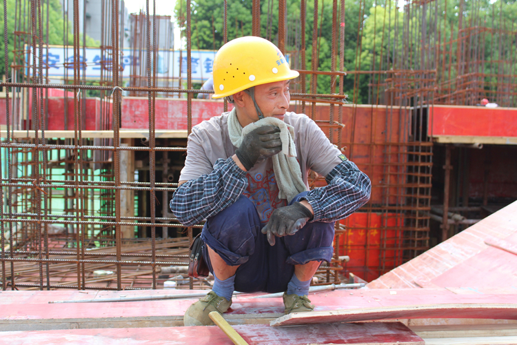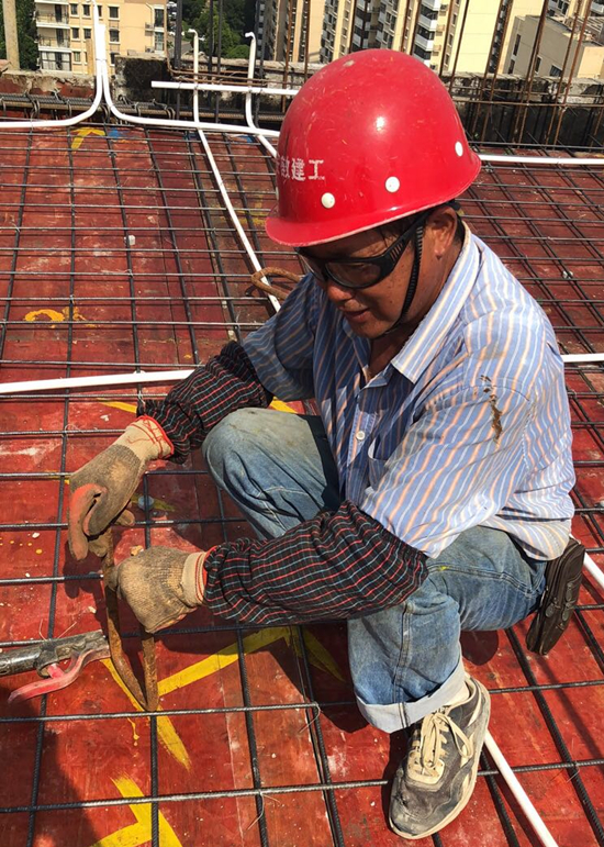 華力勞務公司中海新站區27#售樓部項目現場,鋼筋師傅正在烈日下綁扎鋼筋